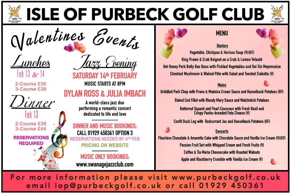 The Isle of Purbeck Golf Club in partnership with the Swanage Jazz Club, Valentine’s Weekend sees Dylan Ross return to his home town joined by a rising star of London’s West-End, Julia Imbach. Fronting a world-class jazz Quartet, they will perform a romantic concert dedicated to two legendary artists in duo, Frank Sinatra and Liza Minnelli. Expect to hear interpretations of iconic jazz standards and some classic love songs in a classy and intimate setting looking over the idyllic Isle of Purbeck.